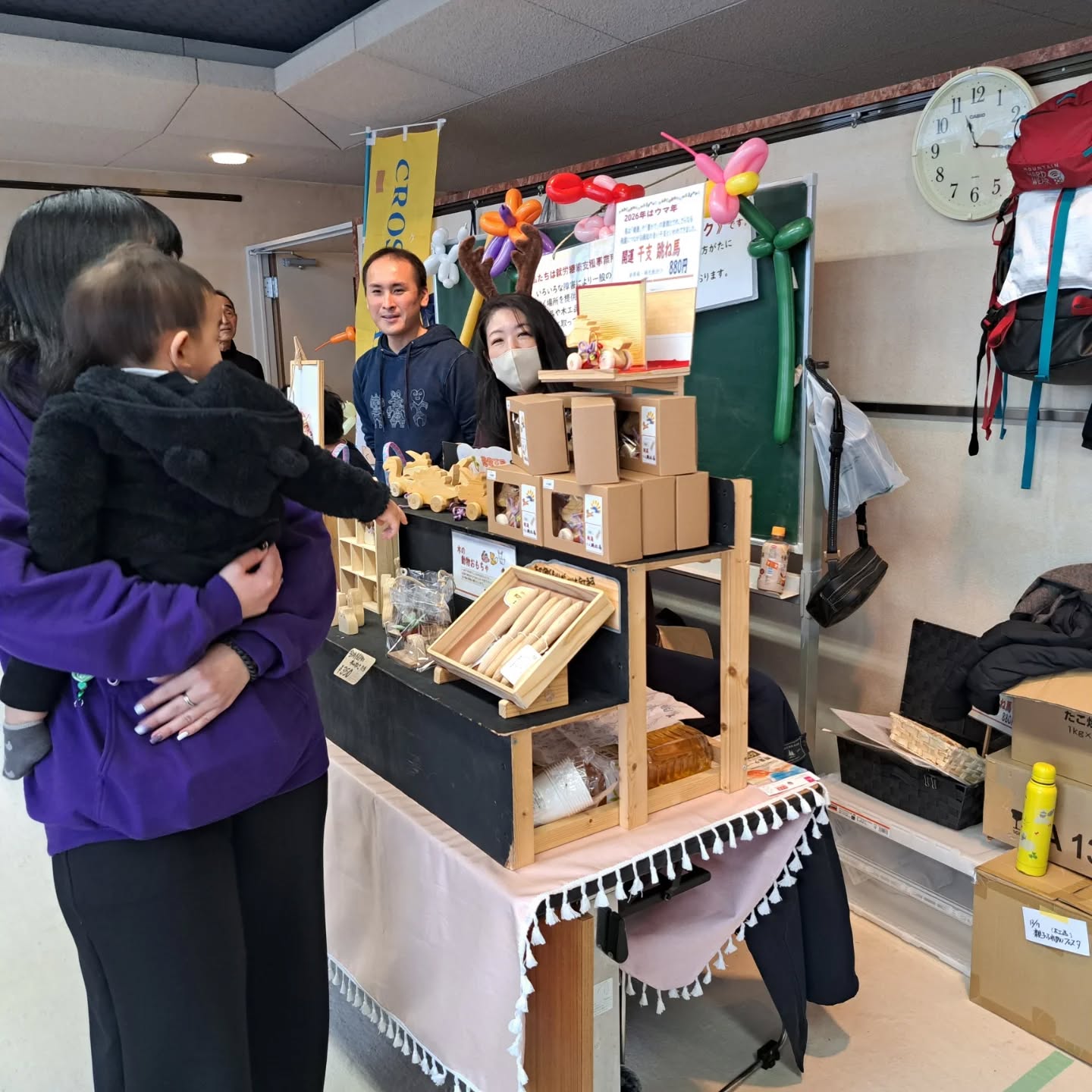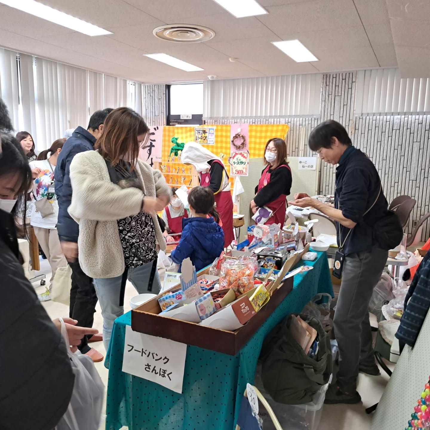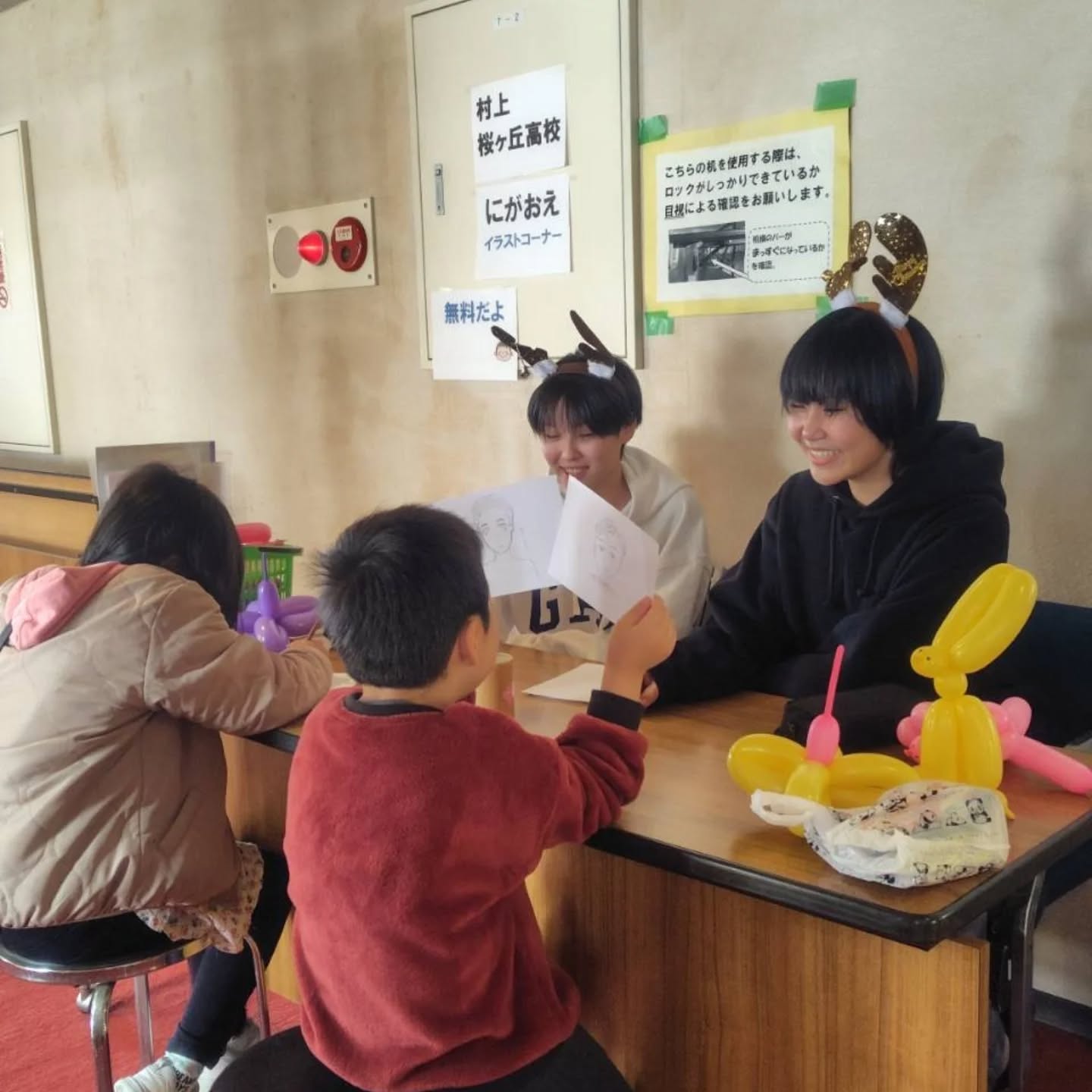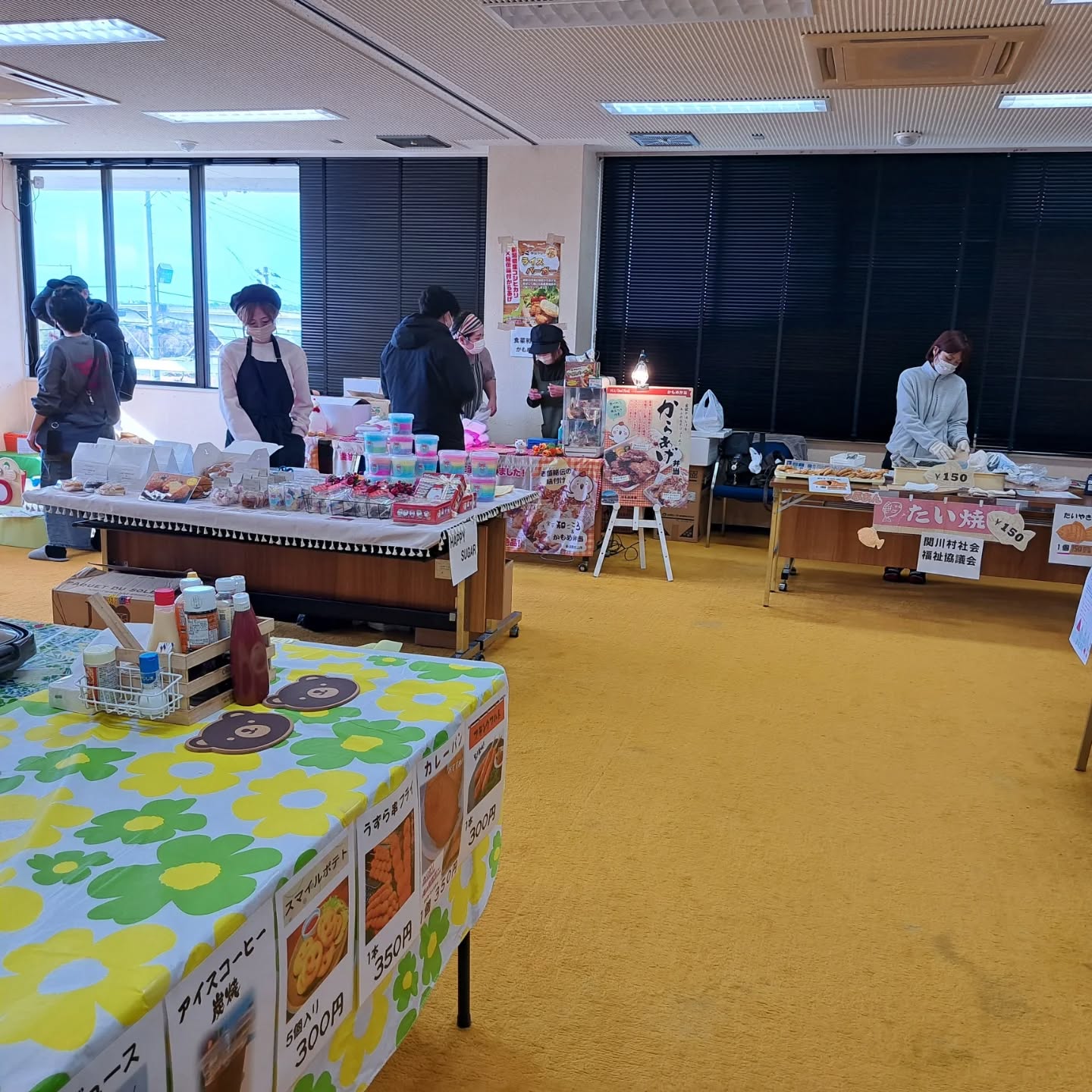 2階ではアートなどのワークショップや、似顔絵を描いてもらう体験コーナー、小物を買い物できるお店など、フリーマーケットや美味しいものが食べられるおいしいもの広場を開催しました。