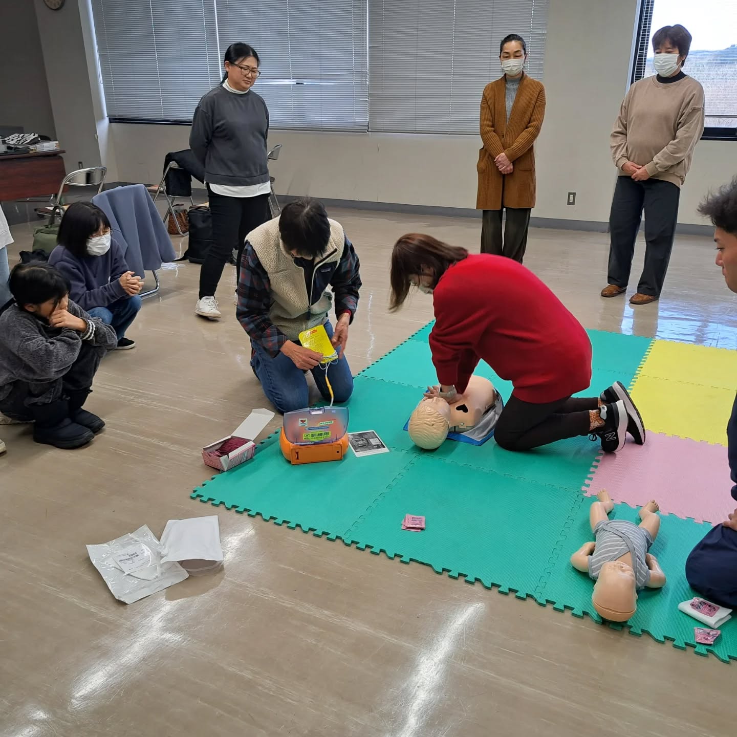 胸骨圧迫(心臓マッサージ)、AEDの使用、大量出血時の止血、そして背部叩打法、ハイムリック法などの誤飲による呼吸困難、窒息への対応などでした。