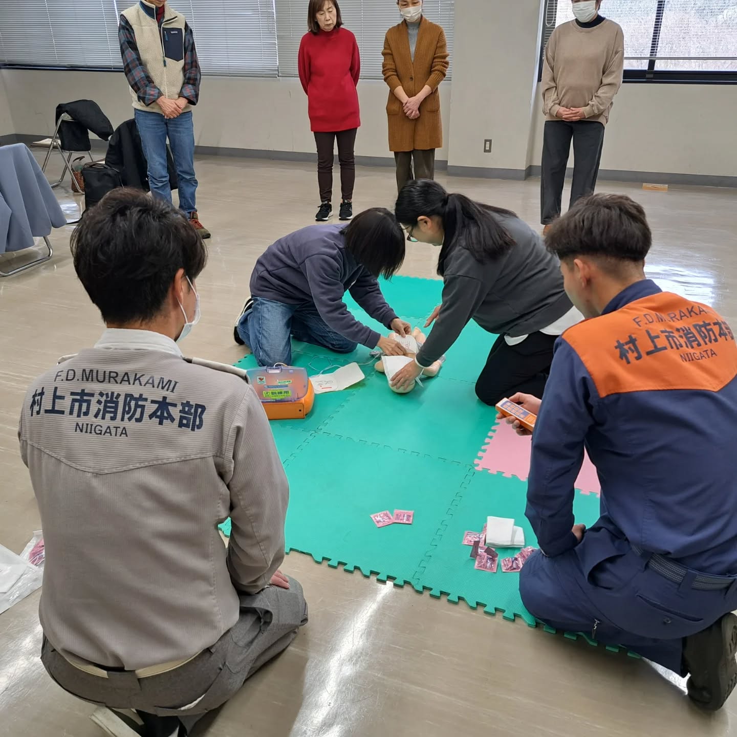 村上市消防本部様に講師をお願いし、今回は一時間半の事前eラーニングと、消防本部での実技講習を中心とした救急法講座で学びました。