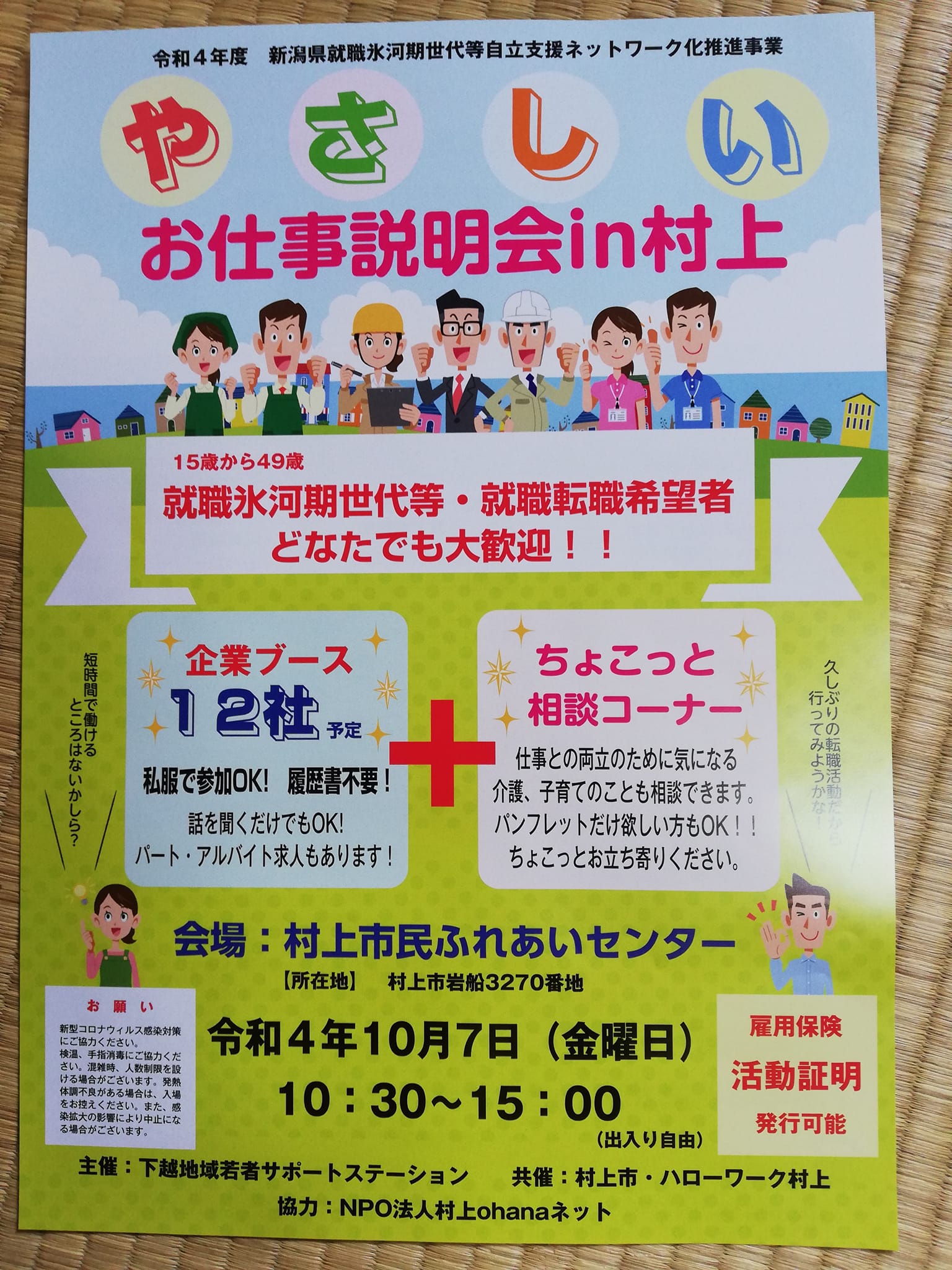 10月7日(金)、村上市民ふれあいセンターで初開催のこちらのイベントは、15才~49才の就活中のどなたもが参加できるものです。