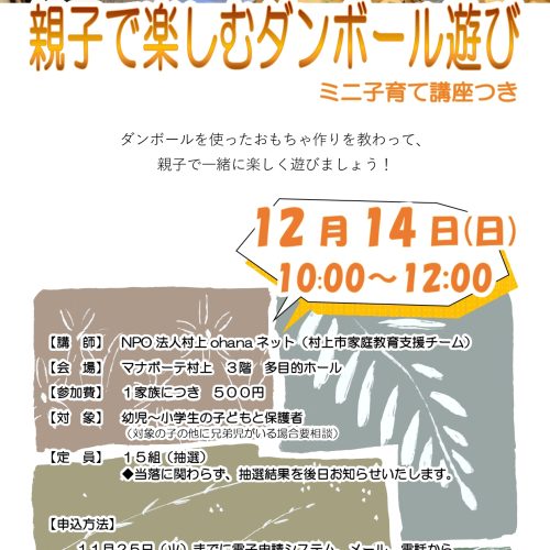 村上パパスクール「親子で楽しむダンボール遊び」の参加親子を募集中です! その他 2025年12月9日 【村上パパスクール「親子で楽しむダンボール遊び」の参加親子を募集中です!】 ダンボールを使ったおもちゃで親子で思いっきり遊びましょう… この記事を見る