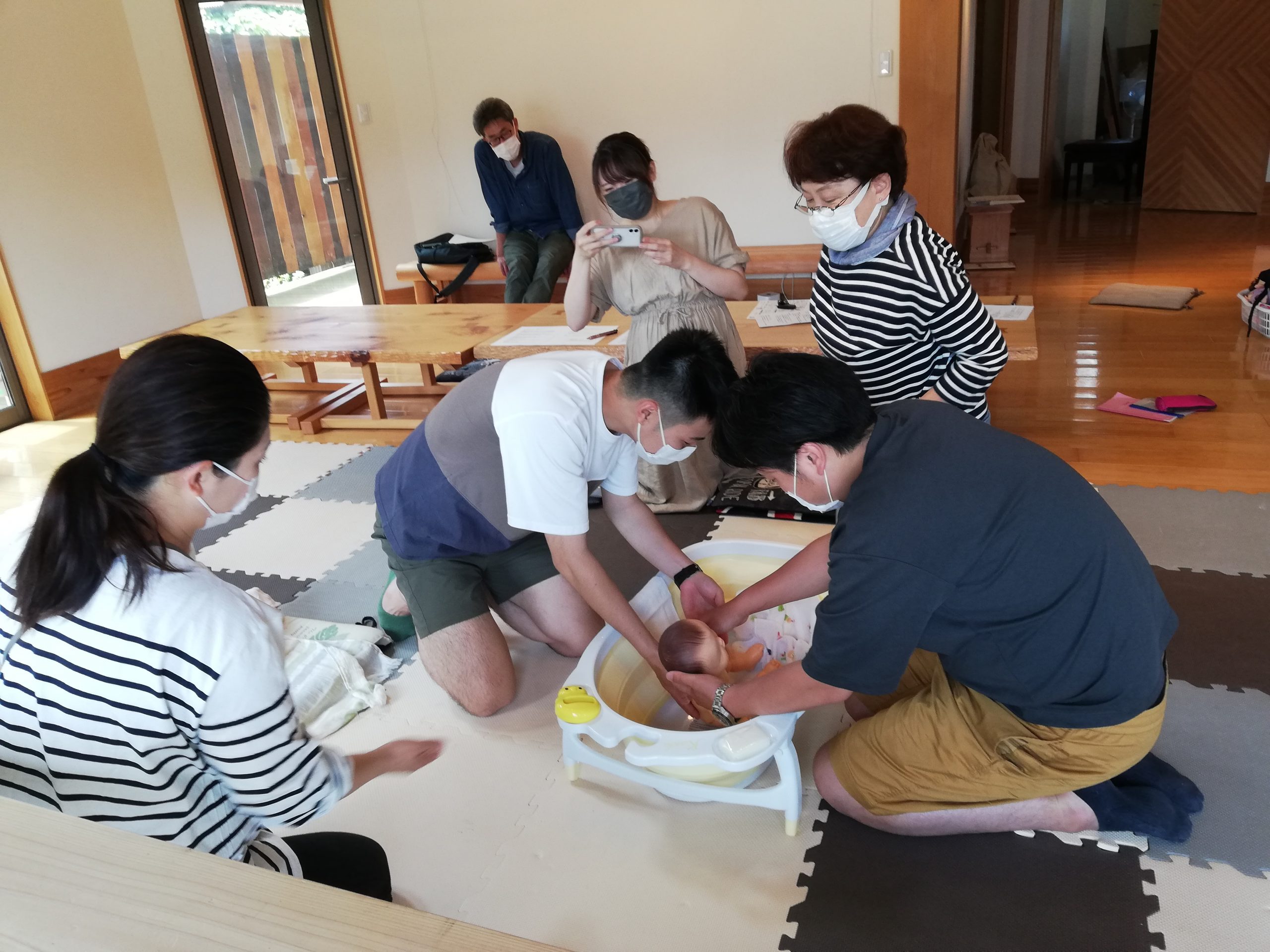 その後、助産師さんと先輩ママサポーターによる『本気の沐浴トレーニング』が行われました(笑)