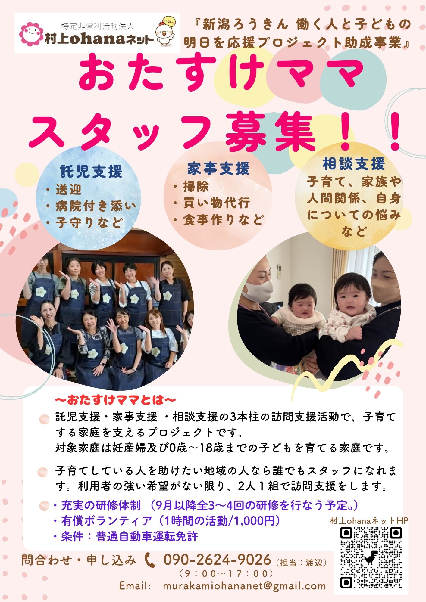 今年度当団体は、『新潟ろうきん 働く人と子どもの明日を応援プロジェクト』助成を受け、0歳~18歳までの子どもを育てる家庭を【託児】【家事】【相談】の3つの支援でサポートするおたすけママ事業の支援体制整備と利用促進に向けた取り組みを行います。