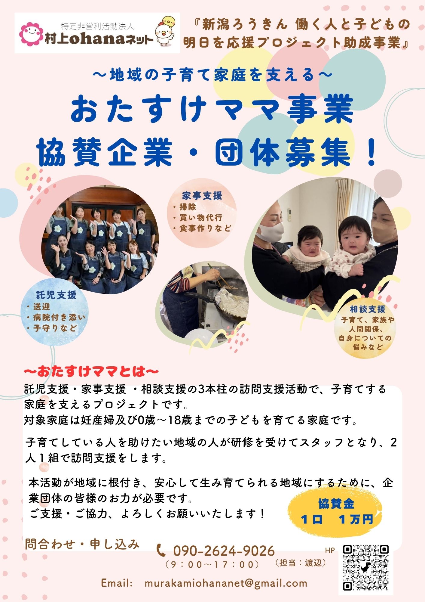併せて、おたすけママ事業を支えていただける応援協賛企業・団体様を募集します。